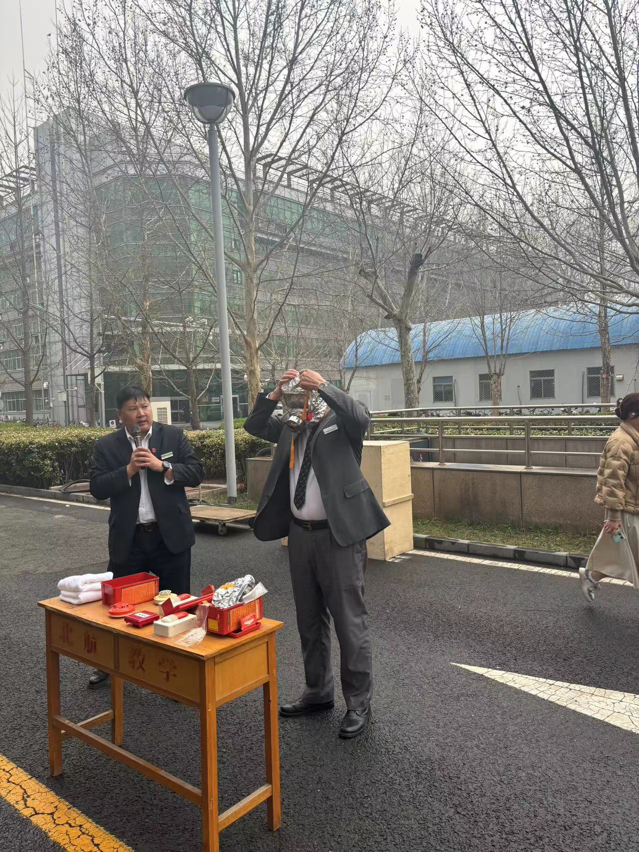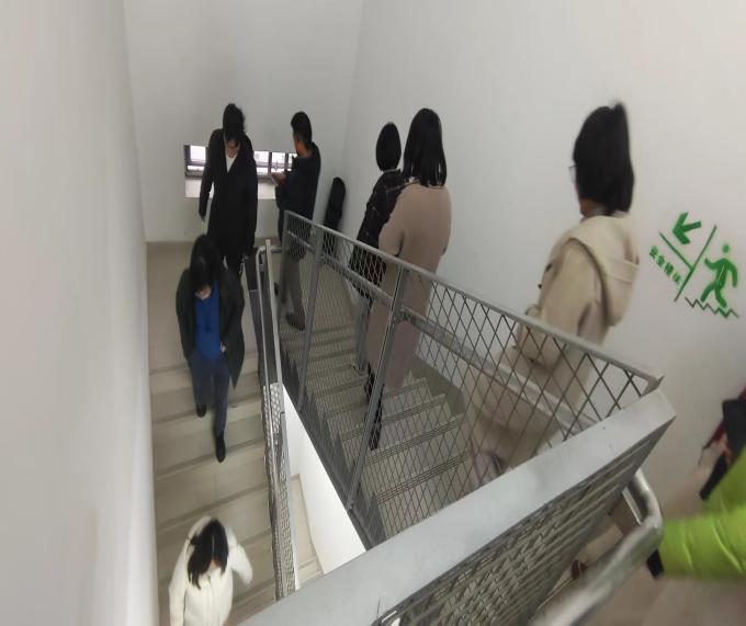 随着紧急疏散警报的拉响,楼内的学院师生在物业人员的指引下快速地从安全通道逃生,迅速到达新主楼E座西门外的疏散集合点,顺利完成了应急疏散环节。整个疏散过程紧张而有序,所有师生均撤离到了指定位置,未发生任何混乱和意外,达到了预期效果。
