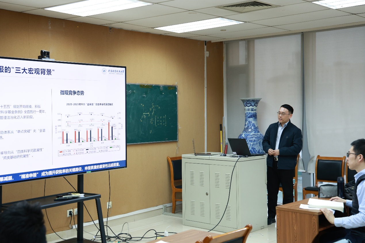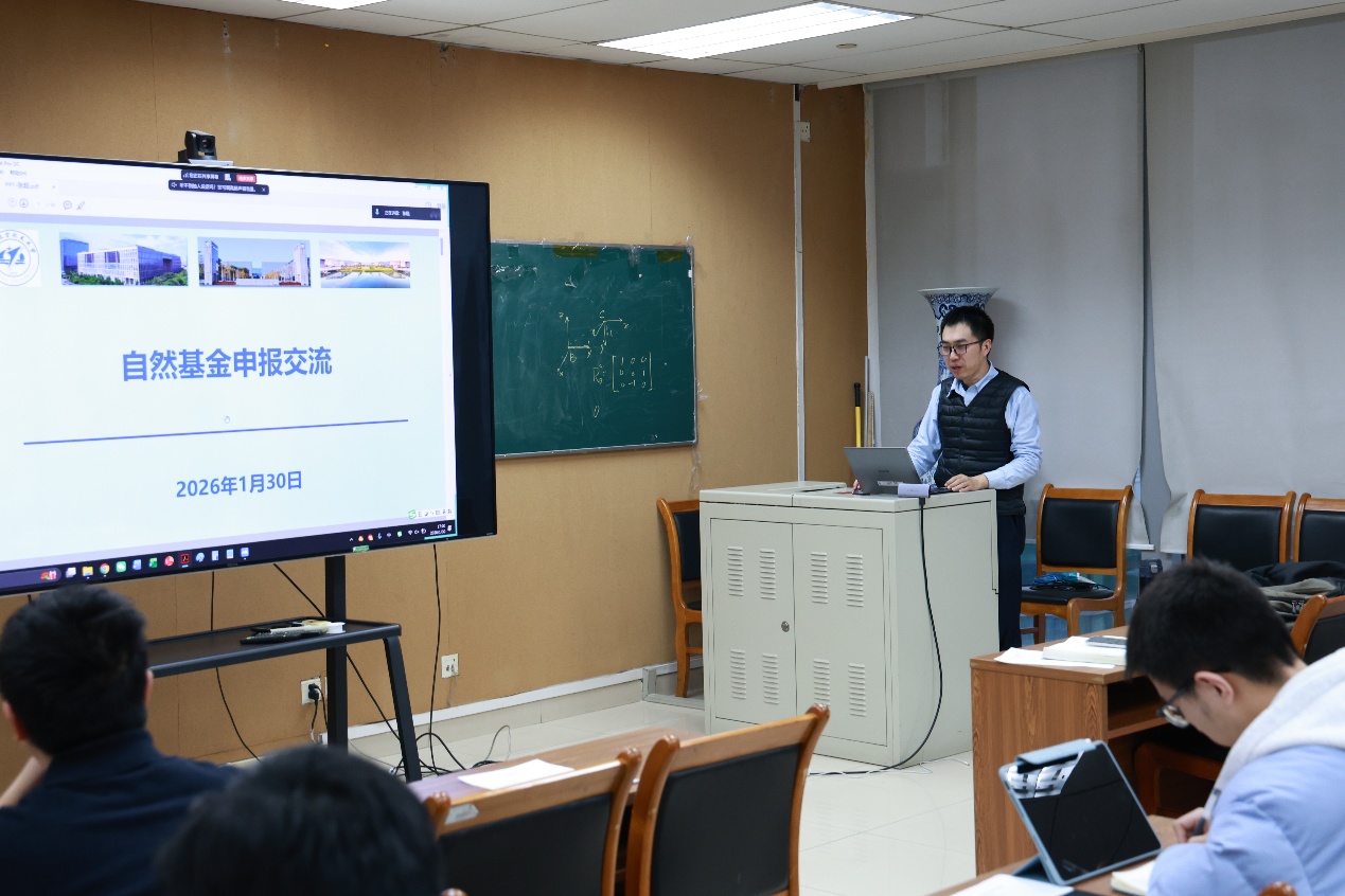 最后,张超教授作报告分享,首先介绍了2025年度学校在国家自然科学基金项目申报中取得的突出成绩;然后重点讲述了2026年度基金申报的新政策与新导向,包括加大对青年人才的支持力度、设立重大非共识项目试点、新增“科学工具”专项代码、优化申请书结构等关键举措,并对2026年学院的基金申报工作及关键时间节点进行了说明。