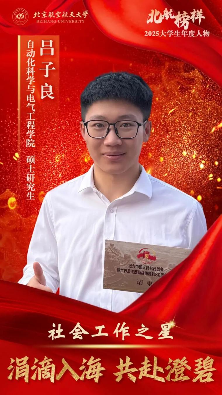 (通讯员 吕子良 韩泉萌)近日,北京航空航天大学2025年“北航榜样——大学生年度人物”评选结果揭晓。beat365正版唯一官网必一2023级硕士研究生吕子良表现卓越,脱颖而出,荣获“社会工作之星”称号。他以热忱之心投身多项实践,展现了新时代北航学子的家国情怀与责任担当。